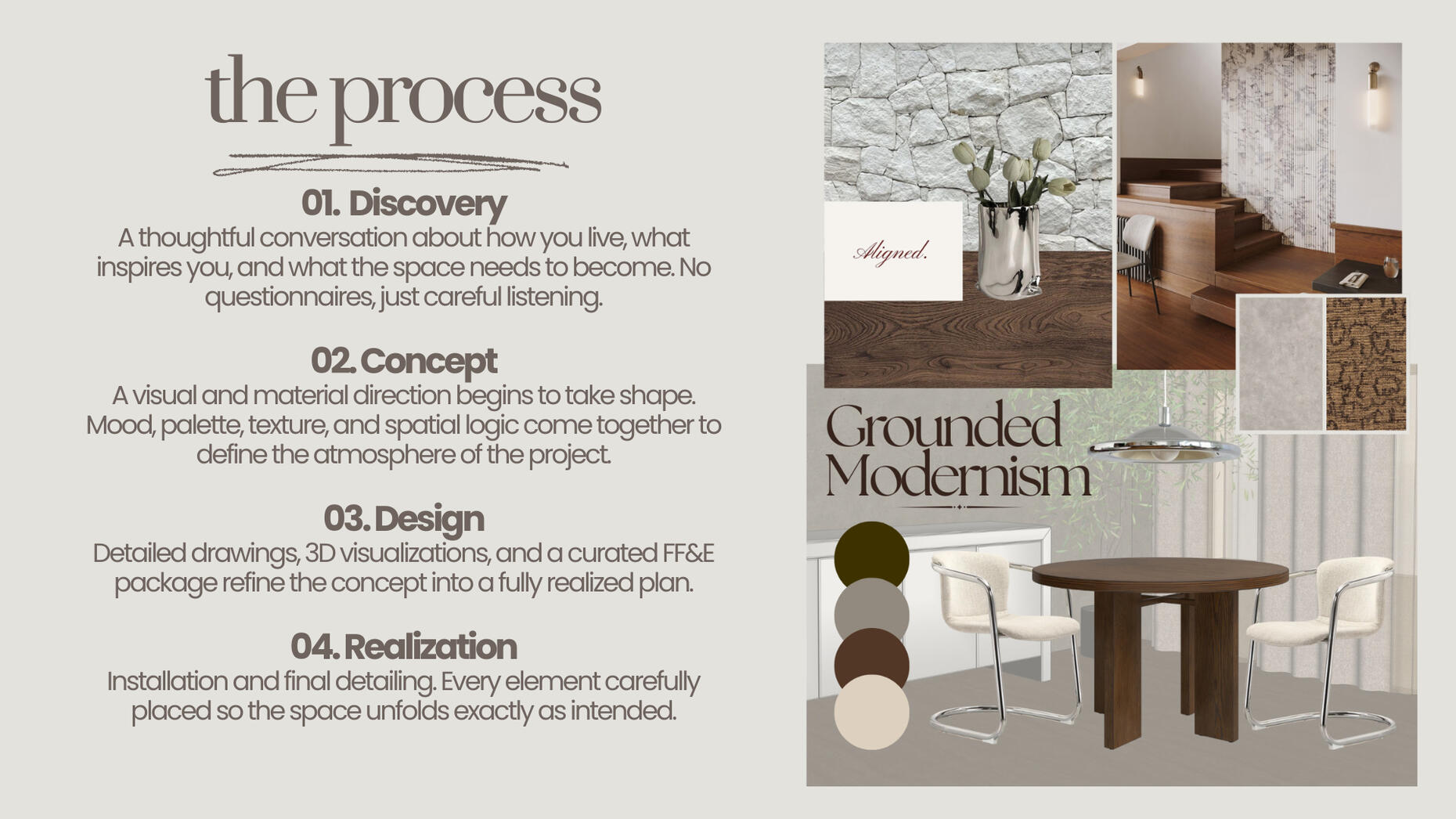 A structured remote design service for clients beyond our local area. Includes 3D visualizations, concept boards, sourcing guides, and thoughtful implementation support.05. Brand Environments